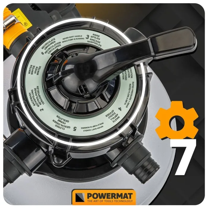 7-позиционният контролен вентил предлага режими като филтриране, изплакване, циркулация, източване и зимен режим, което позволява гъвкаво регулиране на работата на помпата спрямо работните условия.