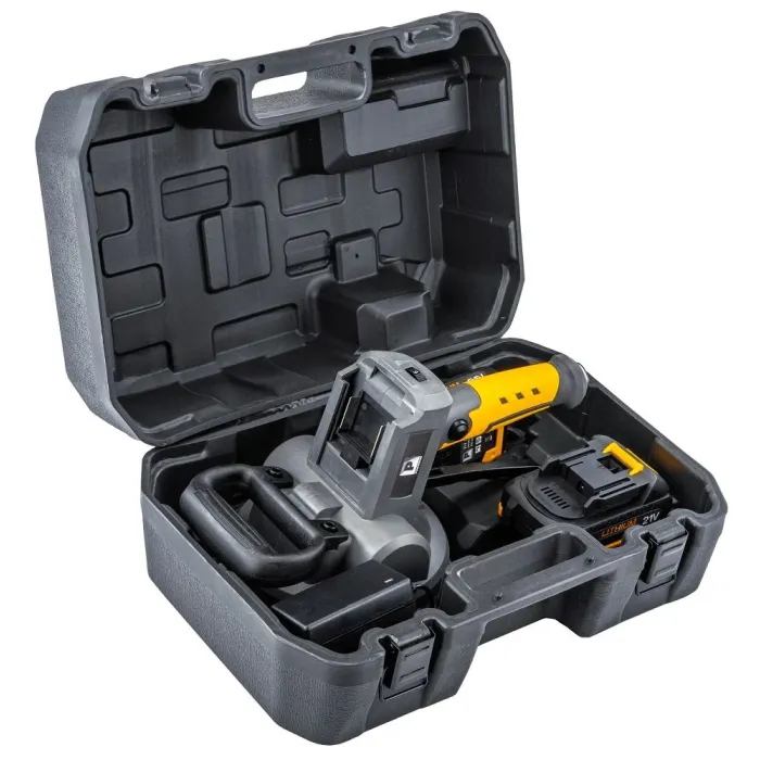 Литиево-йонната батерия с капацитет 2000 mAh позволява дългосрочна употреба без необходимост от често зареждане. Комплектът включва две батерии 21V/2Ah за непрекъсната работа – едната се зарежда, докато другата се използва.