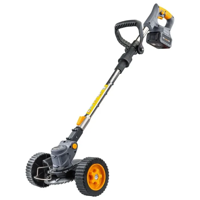 Специалните колела улесняват маневрирането на устройството, осигурявайки стабилност и равномерно рязане по цялата повърхност. Благодарение на тях, тримерът може да се управлява подобно на традиционна косачка за трева. Оборудването му включва капак, който ефективно предпазва устройството от евентуални повреди при работа по стени.