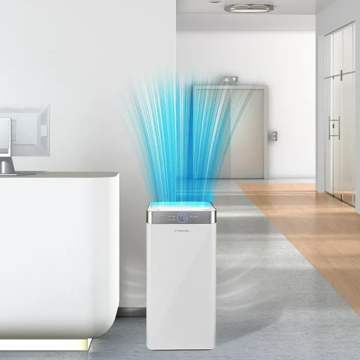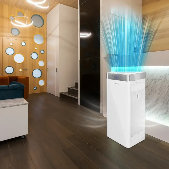 Вертикалното центробежно работно колело с двойна гравитация на високоефективния вентилатор позволява постоянно висок въздушен поток с ниски нива на шум. Замърсеният въздух в помещението се засмуква близо до земята през отворите за въздух отстрани на устройството. След това въздухът преминава през комбинираните отделения с предфилтър, HEPA и CARBON филтърна технология вътре в устройството. Чистият и без замърсители въздух се издухва обратно в помещението през оптимизираните за потока изпускателни клапи в горната част на устройството. Чрез циркулация на въздуха, въздухът се разпределя и разпространява приятно в цялото помещение.