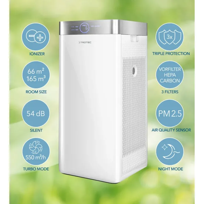 Благодарение на комбинираната филтърна система с HEPA въглен и предфилтърна технология от двете страни на устройството и допълнителна йонизационна функция, фините частици, алергените и други патогени се филтрират надеждно от въздуха в помещението.