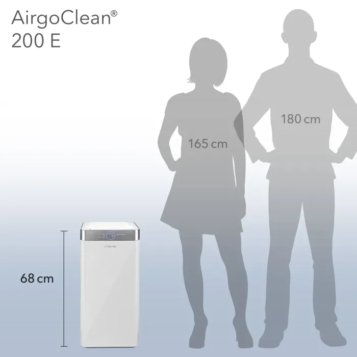 Въздухопречиствателят AirgoClean® 200 E съчетава награждаван дизайн, мощна HEPA филтърна технология и гарантира изключително лесна работа. Модерният LED дисплей показва стойността на финия прах и качеството на въздуха в помещението в реално време, а петстепенна стълбова диаграма показва кога е необходима смяна на филтъра. Убедителните характеристики на AirgoClean® 200 E се допълват от три режима на работа (автоматичен, турбо и нощен режим).