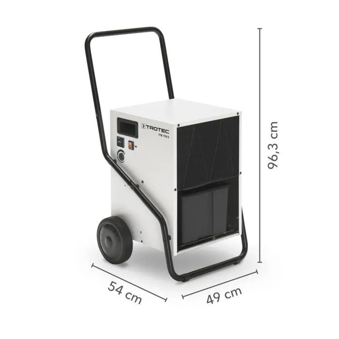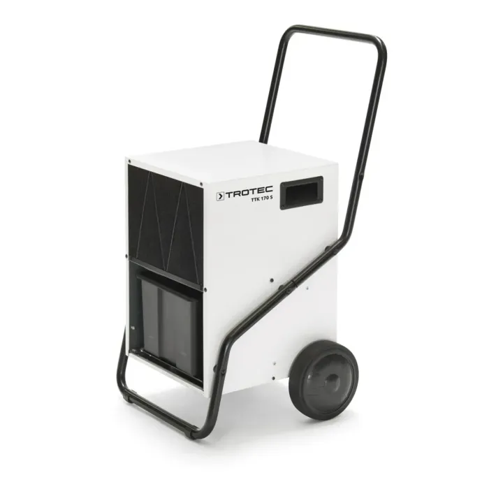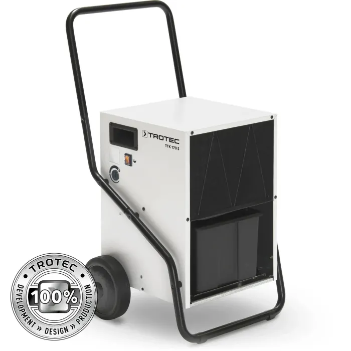 TTK 170 S е оборудван с професионална система за автоматично размразяване с горещ газ и обезвлажнява помещения с площ до 180 м² с капацитет до 50 литра за 24 часа. Този мощен конструктивен влагоабсорбатор е с хигростатно управление, а желаната влажност може да бъде предварително избрана между 32% и 100% относителна влажност благодарение на практичен въртящ се превключвател. Освен това, той генерира въздушен обем от 580 кубически метра на час. Стабилната му конструкция тип количка и големите колела улесняват честото преместване.