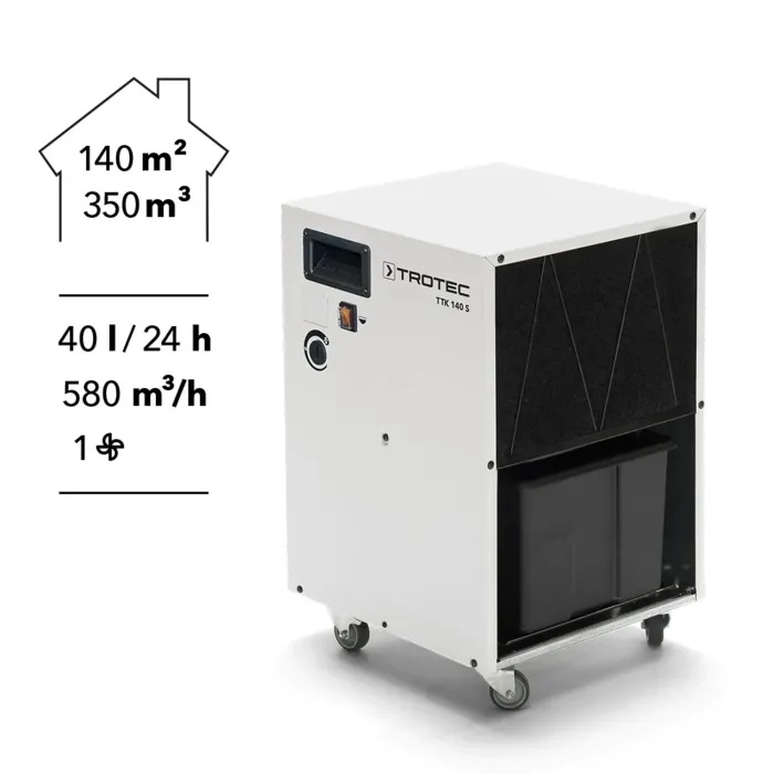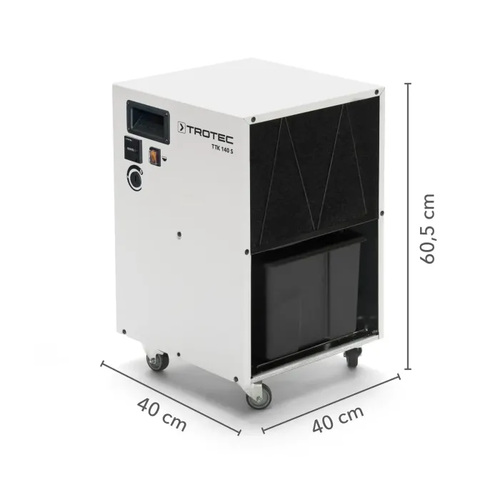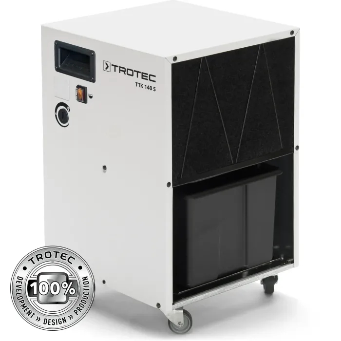 С този компактен индустриален влагоабсорбатор можете да се възползвате от бюджетно решение за обезвлажняване, без да правите компромиси по отношение на изработката и надеждността. TTK 140 S, предлаган ексклузивно в Trotec, е с традиционно производство в ЕС и демонстрира по респектиращ начин, че ценовото ниво на Далечния изток наистина е съвместимо със солидното качество на марката.
