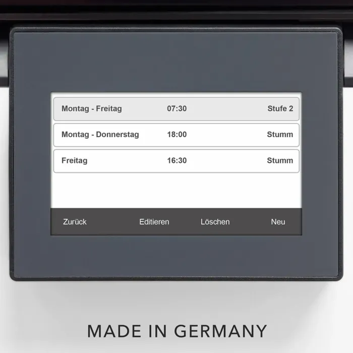 Докато класическите таймери обикновено позволяват само предварителен избор на време за включване и изключване, AirgoClean ® One разполага с първокласен работен планиращ инструмент. Желаните времена за включване и изключване могат да бъдат прецизно зададени за всеки отделен ден от седмицата или за всички дни заедно.