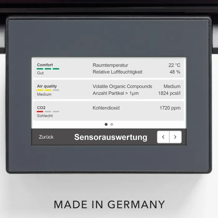 Тройна сензорна система за качество на въздуха – вградените сензори откриват летливи органични съединения (ЛОС), ултрафин прах (PM1) и въглероден диоксид (CO2 ) във въздуха в помещението
