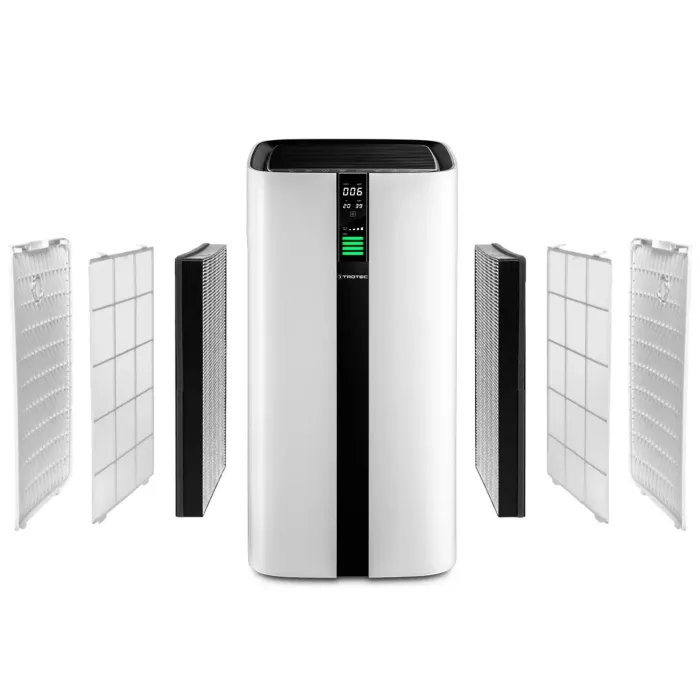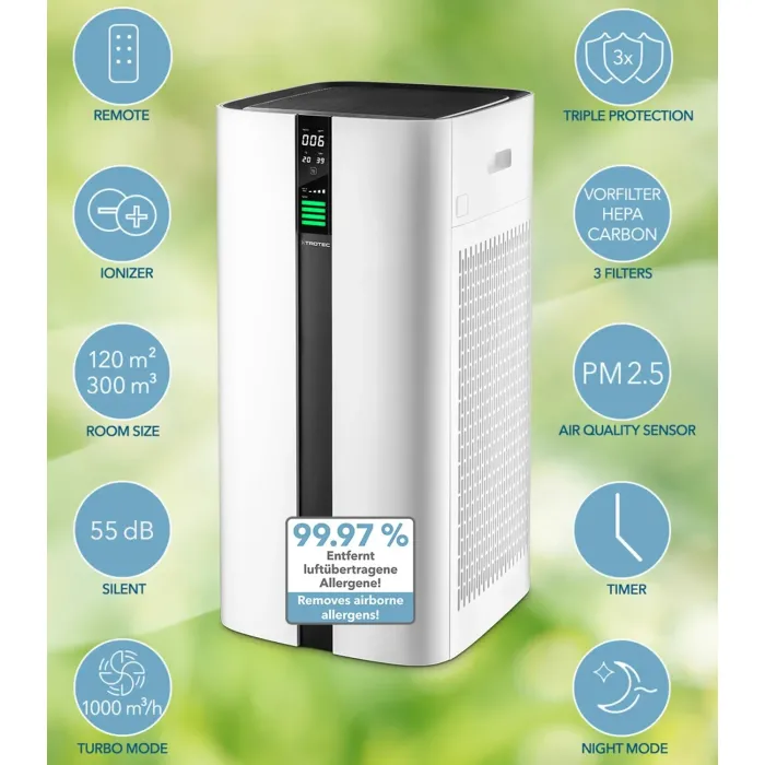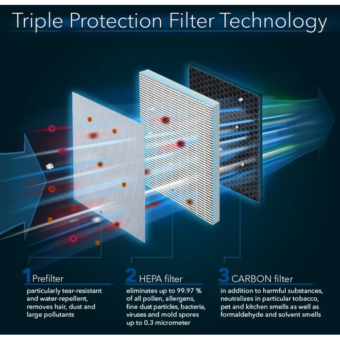 Благодарение на комбинираната филтърна система от HEPA въглен и предфилтърна технология с двоен дизайн с допълнителна йонизация, фините прахови частици, алергените и други патогени се филтрират надеждно от въздуха в помещенията.
