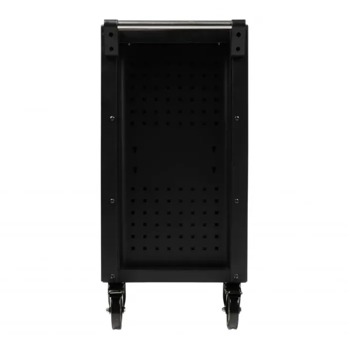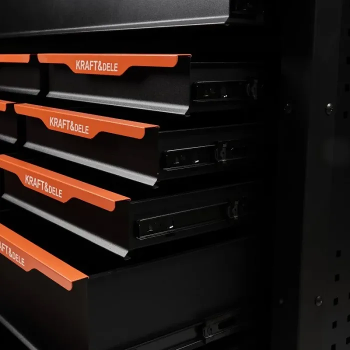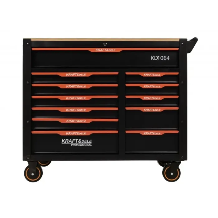 Всяко чекмедже е монтирано върху лагерни водачи, което прави отварянето им плавно, тихо и издръжливо. Големите колела, оборудвани с автоматично заключване и спирачка, осигуряват безопасност при преместване на шкафа дори по малки наклони. Шкафът за инструменти е незаменим продукт във всяка автосервиз и гараж. Шкафът е оборудван с гумени брони, за да се предотврати повреда на каросерията на автомобила в случай на случаен удар. Системата за заключване на чекмеджетата позволява отварянето само на едно чекмедже.