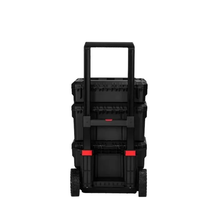 Здравата ѝ конструкция и добре обмисленото пространство я правят незаменимо решение за работилници, сервизни центрове и любители на „Направи си сам“. Количката е оборудвана с транспортни колела и телескопична дръжка, което я прави лесна за преместване, дори когато е напълно натоварена. Практична и мобилна количка за инструменти, оборудвана с три просторни кутии, идеална за съхранение и транспортиране на инструменти, аксесоари и монтажни компоненти.