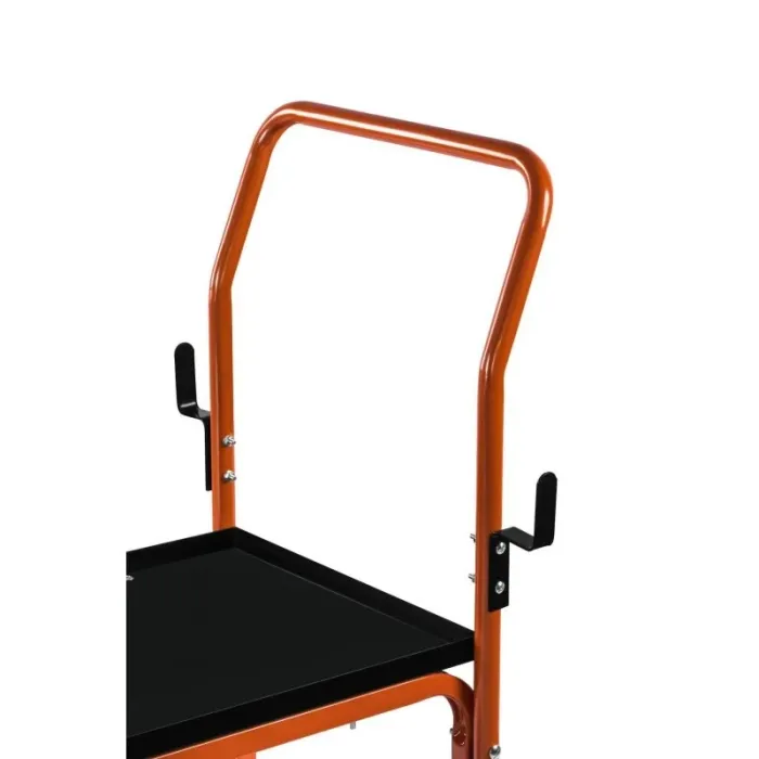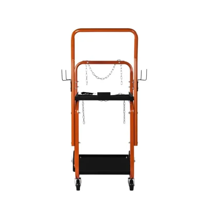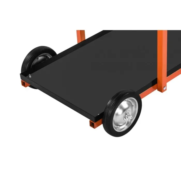 Здравата и издръжлива конструкция, изработена от най-висококачествена стомана, означава, че количката има товароносимост до 70 кг! По-големите колела отзад и по-малките отпред позволяват лесно маневриране. Два рафта и рафт за бутилки с монтажни вериги осигуряват стабилност на бутилката. Оборудван с четири куки за окачване на заваръчни горелки или маркучи, той улеснява работата на заварчика. Професионалната заваръчна количка е идеално решение за транспортиране на MIG/MAG/TIG заваръчни апарати или плазмени резачки, както и за всякаква употреба в работилници.