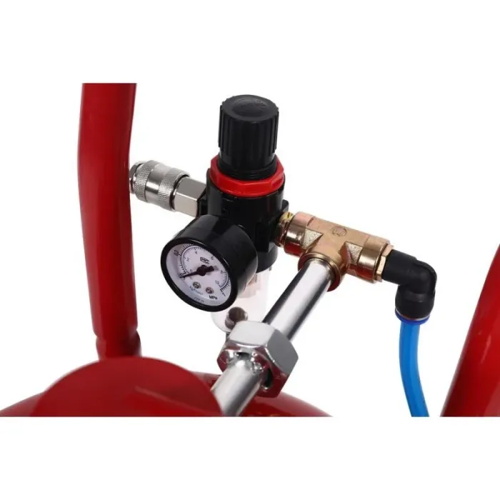 Целият уред е монтиран на практична стойка с колелца, което позволява лесно преместване. Комплектът включва и необходимия въздушен маркуч за бързо свързване към компресор.