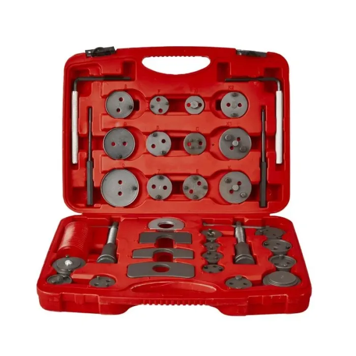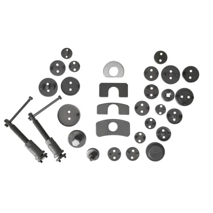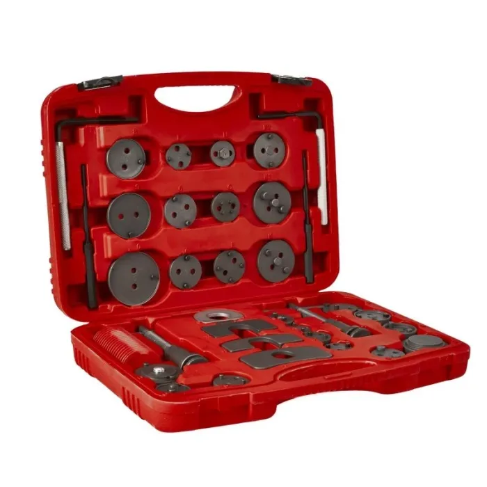 Комплектът е изработен от висококачествена стомана, опакован в здрав пластмасов калъф. Копчето е снабдено с магнитен връх, който държи всеки адаптер. Идеален за работа с керамични бутала. Професионален комплект за прибиране и натискане на спирачни бутала, необходим за ремонти на превозни средства, оборудвани с дискови спирачки.