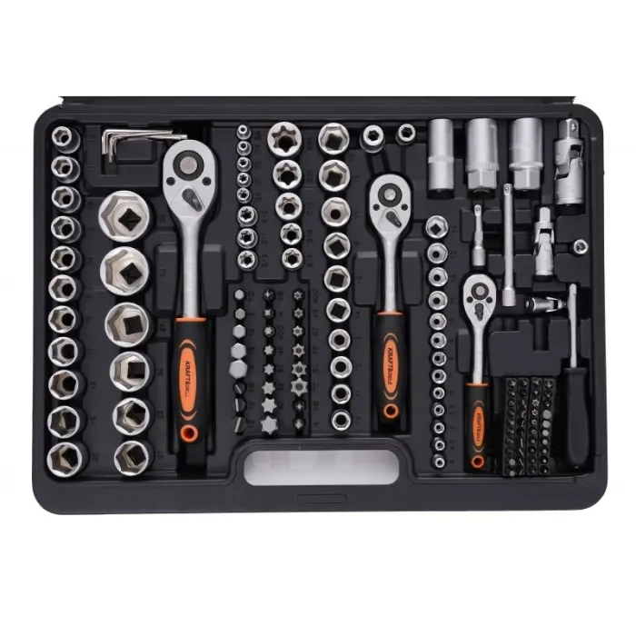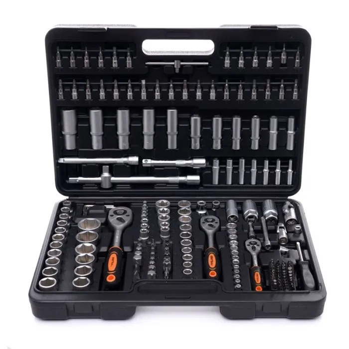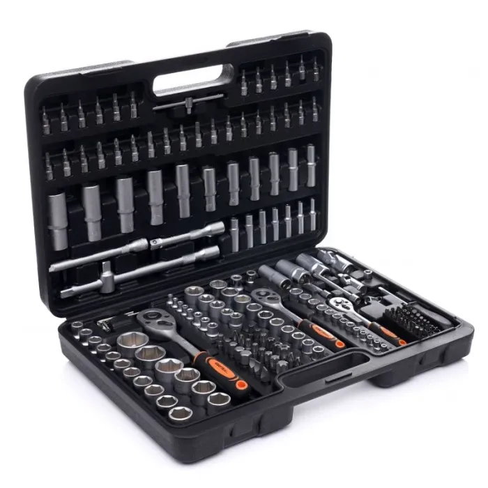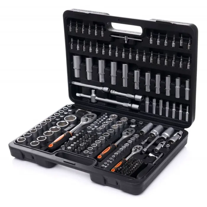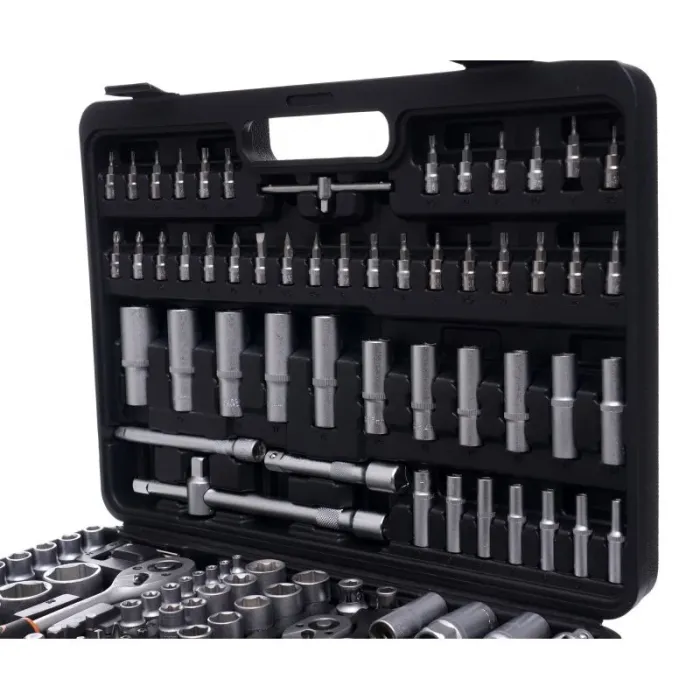 Целият комплект се състои от 292 различни компонента, което гарантира правилния избор на инструменти за вашите нужди. Инструментите са изработени от закалена хром-ванадиева (CrV) стомана, предназначена за инструменти за работилница. Хромът гарантира устойчивостта на стоманата на корозия, окисляване и абразия, както и висока устойчивост на високи температури. Изключително богат комплект инструменти, които се характеризират със солидна изработка, издръжливи материали и удобен куфар за носене, който побира всеки инструмент. Добавянето на ванадий инхибира растежа на зърната по време на обработка, като същевременно увеличава пластичността както на закалените, така и на отпуснатите форми. Кутията, изработена от издръжлива пластмаса, ви позволява да държите инструментите си организирани и лесно да ги транспортирате. Всеки инструмент има свое обособено място, което улеснява намирането на необходимия размер гаечен ключ.