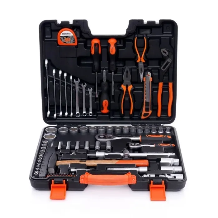 Целият комплект се състои от 83 различни компонента, което гарантира правилния избор на инструменти за вашите нужди. Инструментите са изработени от закалена хром-ванадиева (CrV) стомана, предназначена за работилница. Хромът гарантира устойчивостта на стоманата на корозия, окисляване и абразия, както и висока устойчивост на високи температури. Добавянето на ванадий инхибира растежа на зърната по време на обработка, като същевременно увеличава пластичността както на закалените, така и на отпуснатите форми. Куфара, изработена от издръжлива пластмаса, ви позволява да държите инструментите си организирани и лесно да ги транспортирате. Всеки инструмент има свое обособено място, което улеснява намирането на необходимия размер гаечен ключ. Изключително богат комплект инструменти, които се характеризират със солидна изработка, издръжливи материали и удобен куфар за носене, който побира всеки инструмент.