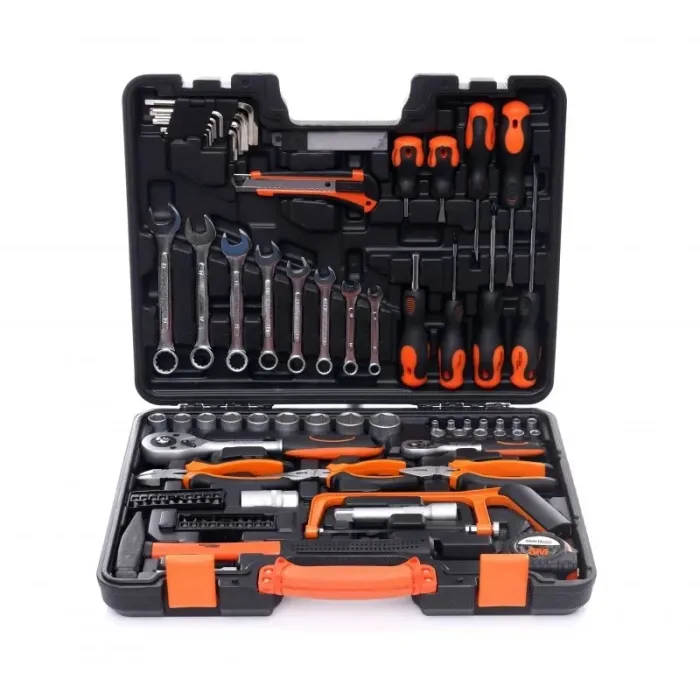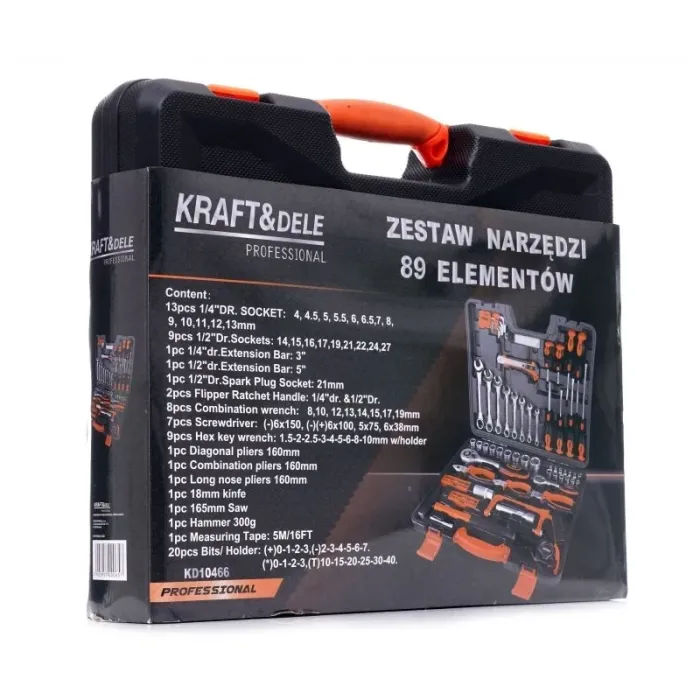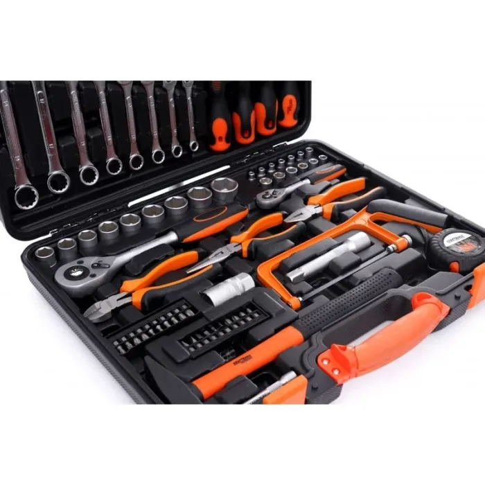 Инструментите са изработени от закалена хром-ванадиева (CrV) стомана, предназначена за инструменти за работилница. Хромът гарантира устойчивостта на стоманата на корозия, окисляване и абразия, както и висока устойчивост на високи температури. Добавянето на ванадий инхибира растежа на зърната по време на обработка, като същевременно увеличава пластичността както на закалените, така и на отпуснатите форми. Изключително богат комплект инструменти, които се характеризират със солидна изработка, издръжливи материали и удобен калъф за носене, който побира всеки инструмент. Целият комплект се състои от 89 различни компонента, което гарантира правилния избор на инструменти за вашите нужди. Куфара, изработена от издръжлива пластмаса, ви позволява да държите инструментите си организирани и лесно да ги транспортирате. Всеки инструмент има свое обособено място, което улеснява намирането на необходимия размер гаечен ключ.