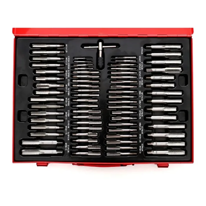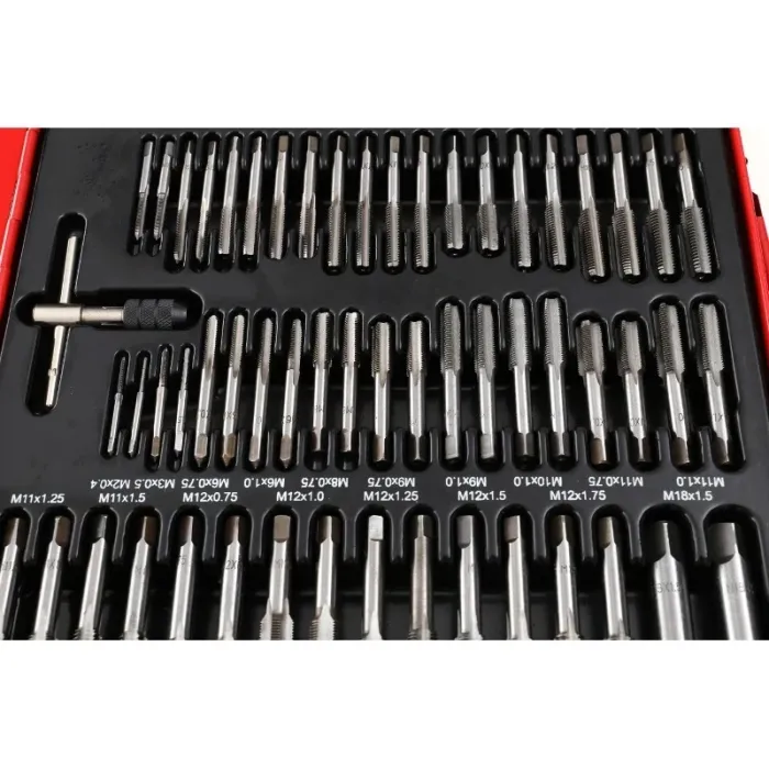 Този комплект е предназначен за ремонт на всички видове резбови съединения в повечето материали. Богатият набор от компоненти го прави изключително универсален. Всичко е опаковано в здрав метален куфар с обособени места за всеки инструмент, за да се поддържа ред. Комплект от 110 метчиц и плашки, изработени от закалена стомана с най-високо качество, идеалени за всяка работилница или гараж.