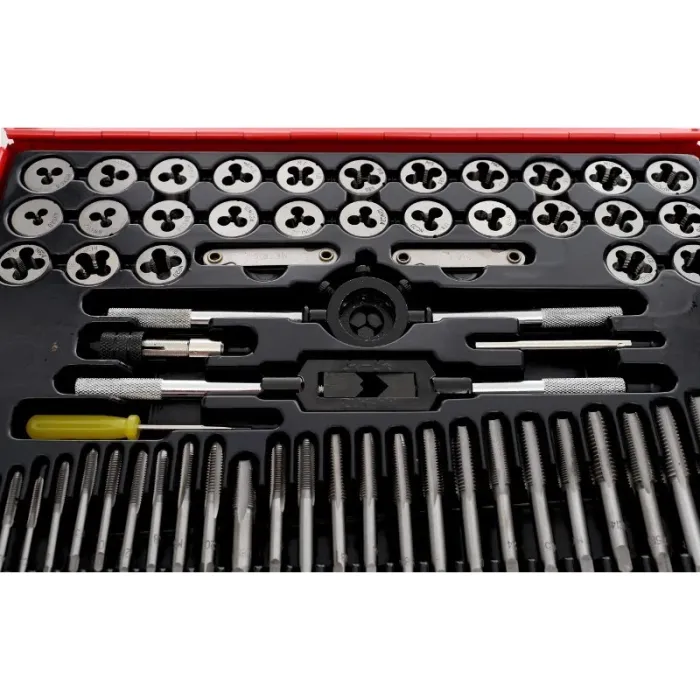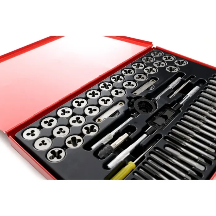 Този комплект е предназначен за ремонт на всички видове резбови съединения в повечето материали. Богатият му набор от компоненти го прави изключително универсален. Допълнителен вложков ключ и две ръкохватки позволяват лесна работа без нужда от допълнителни аксесоари. Комплектът съдържащ 60 метчици и плашки изработени от закалена стомана с най-високо качество и е перфектно допълнение към всяка работилница или гараж.