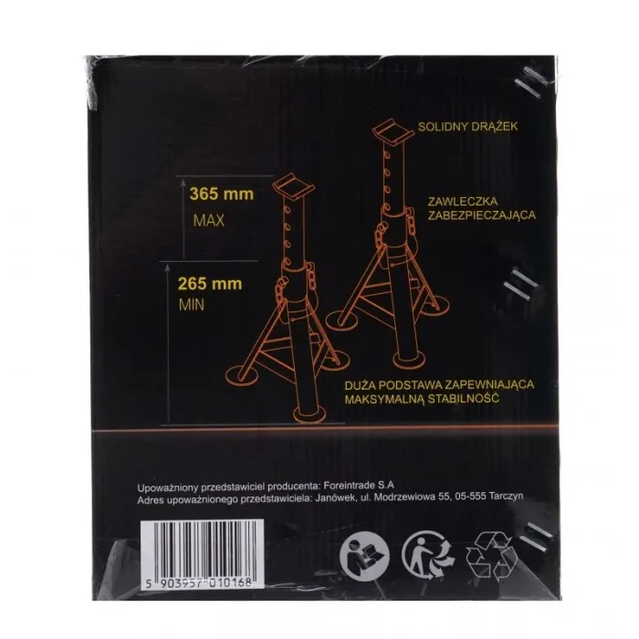 Трикракият дизайн с вътрешни подложки ефективно предотвратява потъването в земята при работа под товар. Те разполагат с тристепенно регулиране на височината, което ви позволява лесно да настроите седалката до желаната позиция. Предпазителна игла предотвратява случайно изплъзване на лоста и значително повишава безопасността при работа. Стойките са с максимална товароносимост 2 тона са изработени от висококачествена стомана, устойчива на механични повреди, огъване и химикали за работилницата. Те ще осигурят стабилно повдигане при всякакви условия.