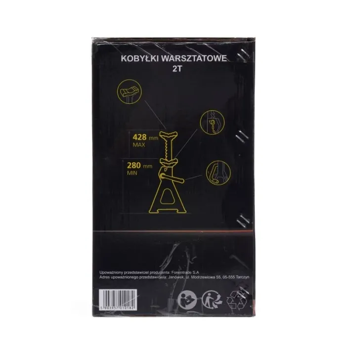 Четирикракият дизайн с вътрешни подложки ефективно предотвратява потъването в земята при работа под товар. Те са оборудвани с 10-степенно регулиране на височината с тресчотка, така че можете лесно да настроите седалката в желаната позиция. Стойките са с максимална товароносимост 2 тона. Изработени от висококачествена стомана, те са устойчиви на механични повреди, огъване и химикали за работилница. Те ще осигурят стабилно повдигане при всякакви условия.