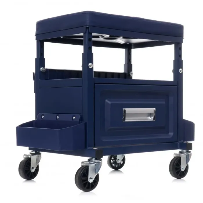 Тя разполага с просторно чекмедже с товароносимост приблизително 9 кг. Освен това има три рафта, които лесно побират инструментите, използвани по време на работа. Удобна седалка, изработена от PVC. Мобилната табуретка е предназначена за употреба в професионални работилници, автосервизи, ремонтни работилници и дори домашни гаражи.