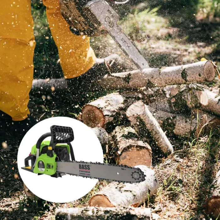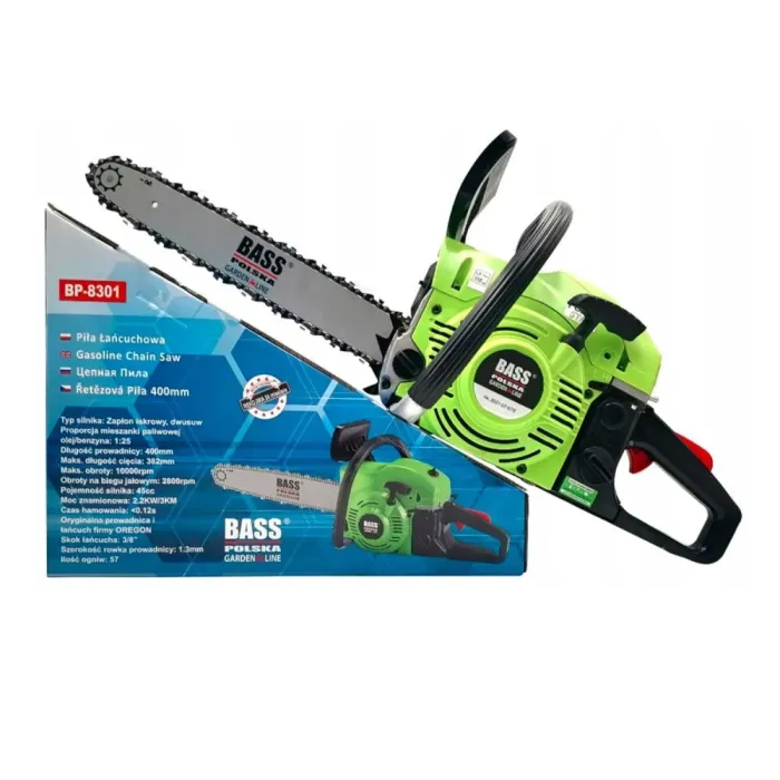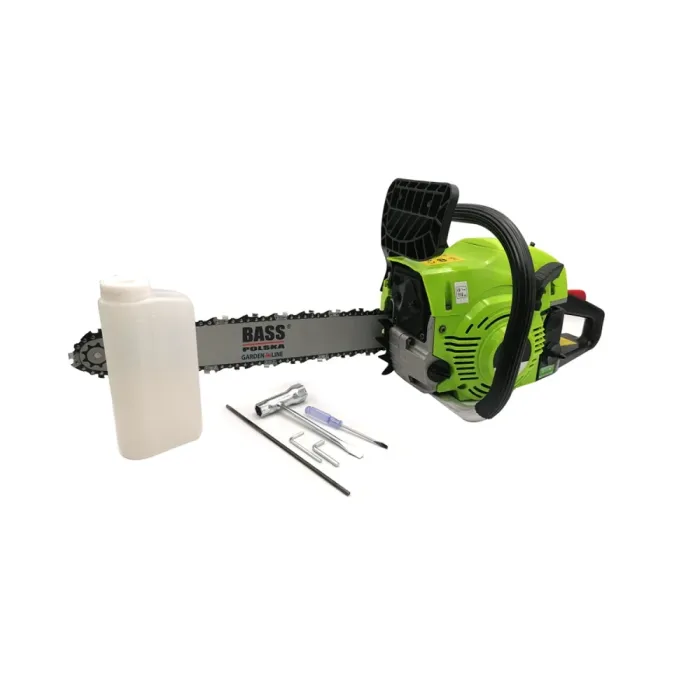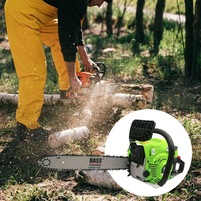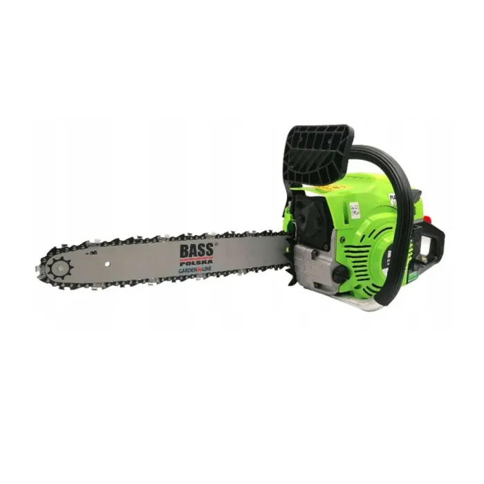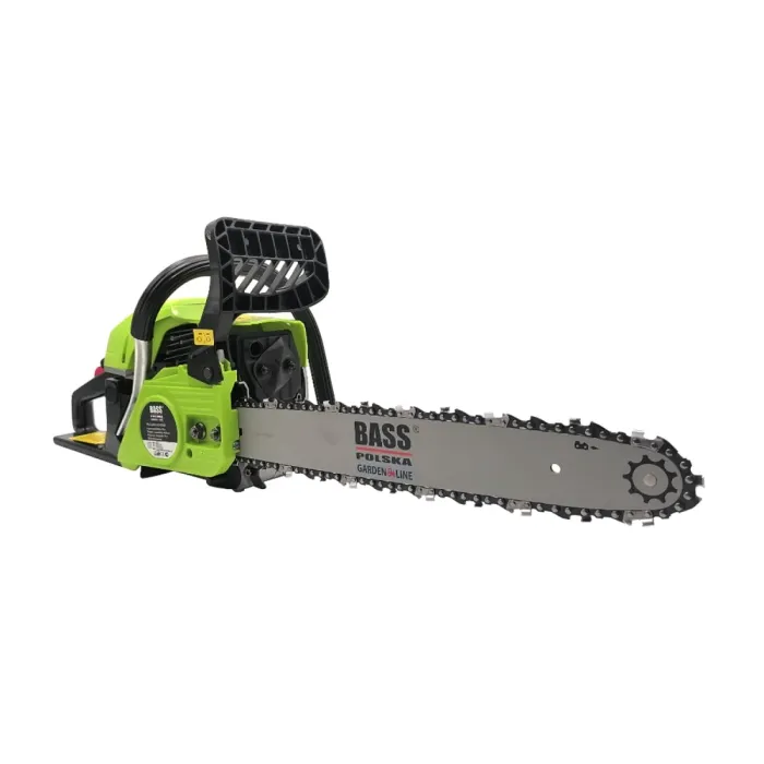 Бързият старт и автоматичното смазване на веригата ускоряват работата и оптимизират производителността на рязане. Ниският център на тежестта и удобната, ергономична дръжка подобряват комфорта на оператора на устройството. Системата за гасене на вибрациите повишава безопасността по време на рязане. Филтърът може бързо и лесно да се отстрани за почистване или подмяна. Трион, оборудван с направляваща шина и верига. Бензиновият верижен трион Bass Polska с компактен дизайн може да се използва за рязане и окастряне на малки и средни дървета, строителни работи и подготовка на дърва за огрев. Мощният двигател позволява прецизни, прави разрези, като същевременно осигурява икономичен разход на гориво и ниски емисии на отработени газове.
