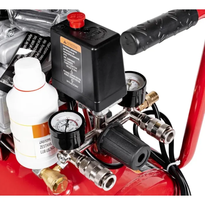 Компресорът има резервоар за въздух с обем 24 литра и мощен модерен двигател с 2 к.с. Максималното налягане, генерирано в цилиндъра, е 8 бара. Конструкцията на буталото с маслено охлаждане осигурява стабилност и дълъг живот на устройството. Двигателят има регулируем клапан с манометри, показващи налягането, удобен превключвател за включване/изключване на устройството и непрекъсната работа (компресорът се изключва автоматично при достигане на максимално налягане).