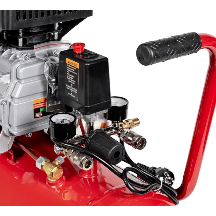 Компресорът има предпазен клапан, зрително стъкло за по-лесна проверка на нивото на маслото и специален клапан , който се използва за отстраняване на натрупаната вода в резервоара, което го предпазва от корозия. Към резервоара е прикрепена удобна дръжка, а долната част на резервоара има колела и крачета, така че устройството да може лесно да се мести. Устройството е оборудвано с термичен превключвател за защита на двигателя от прегряване, два манометра, показващи налягането, и стандартен "бърз контакт" за свързване на въздушни линии.