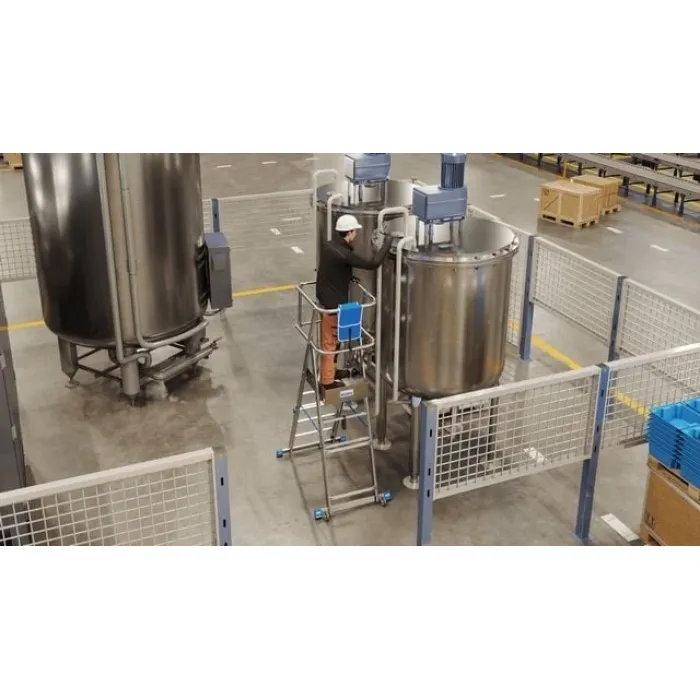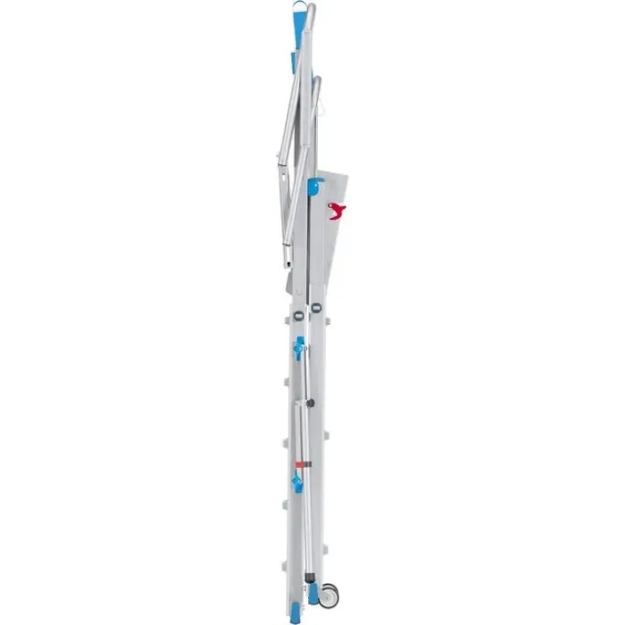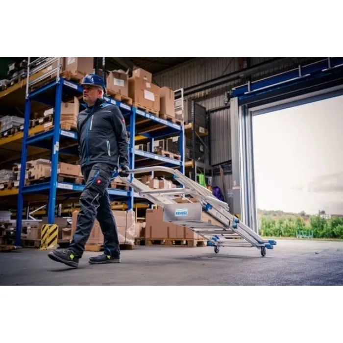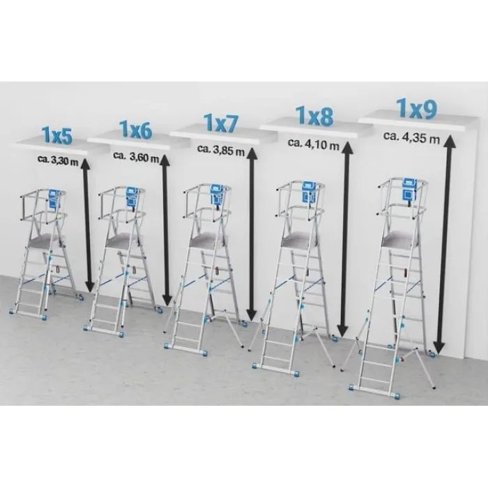 Всички парапети и преходната бариера се позиционират автоматично, когато стълбата се разгъне. Работни височини от 3,30 м - 4,35 м могат да бъдат постигнати с версията на стъпалата от 1x5 до 1x9. Максимална гъвкавост и използване на стълби и площадки благодарение на регулиране на височината от стъпало до стъпало от двете страни. Мобилна, регулируема на височина алуминиева платформена стълба съгласно DIN EN 131-7, едностранен достъп, вкл. 4-странен парапет за безопасна и удобна работа. Удобно и плавно регулиране на височината благодарение на патентованата система ClickMatic. Цялостно безопасно работно място в съответствие с TRBS 2121-2 благодарение на тристранния парапет на платформата и самозатварящата се преходна бариера.