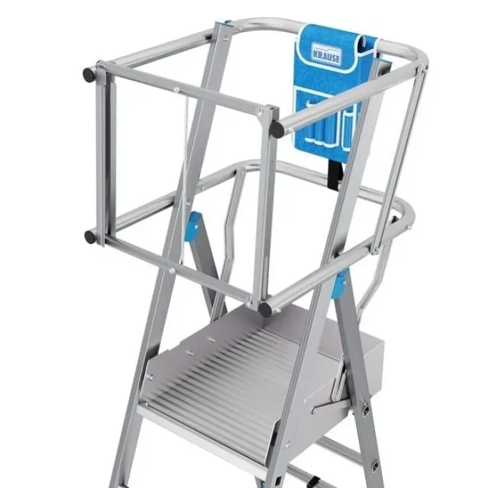 Платформа с размери 600 х 500 мм от противоплъзгащ алуминиев профил. Плавно движещата се закопчалка за бързо освобождаване на платформата осигурява допълнителна стабилност и предотвратява неволно сгъване на стълбата. 150 мм висока предна част за повишена безопасност (200% по-висока от изискванията на стандарт EN 131-7). Здрава фланцова връзка стъпало/релса с равен преход към платформата.