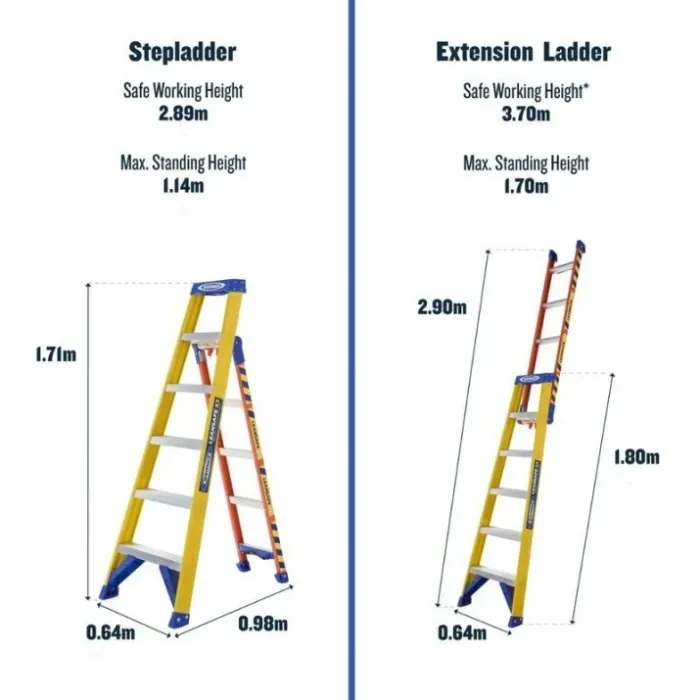 Стълбата е със система за регулиране с една ръка за бърза и лесна смяна на трите режима. Уникален плот, проектиран да се обляга здраво на ъгли на стени, греди, стълбове и плоски стенни повърхности. Стенният буфер за безопасност осигурява здраво захващане при накланяне на пилон или ъгъл. Изработена с помощта на изключително издръжливи, непроводими страници от фибростъкло, силно устойчиви на атмосферни влияния и съпала от алуминий.
