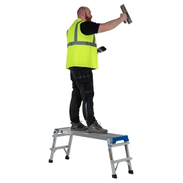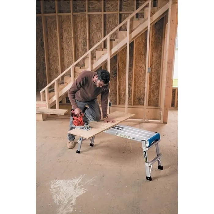 Тази работна платформа се сгъва и става напълно плоска, когато е затворена за лесно транспортиране и съхранение. Работната платформа има голяма работна повърхност и е идеална за всички видове работа около работната площадка. Дръжката Easy-Grab ви позволява да транспортирате платформата в едната ръка, докато държите консумативи в другата. Тънките сгъваеми крака с двойно заключване сигурно се заключват, когато краката са отворени за безопасност и се заключват отново, когато са затворени.