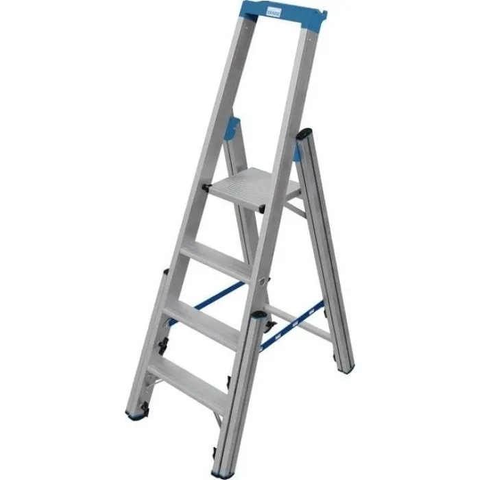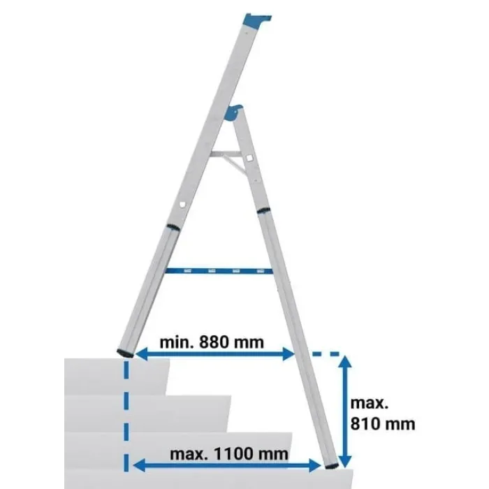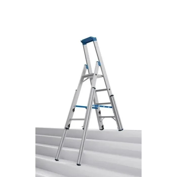 Здрава, обградена от релса, завинтена високотехнологична метална шарнирна връзка. Интегрирана защита срещу задръстване в областта на пантите, осигурена чрез тапи в края на предпазната релса. Здрава алуминиева платформа за безопасност с противоплъзгаща повърхност и повдигачи на платформата от двете страни. Профилирани подсилени D-стъпала с дълбочина 80 мм за безопасно изкачване и удобно стоене отговарят на изискванията на TRBS 2121-2 за използване на стъпала като работно място. Високоякостни фланцови връзки стъпало/странична релса. Двукомпонентни тапи за крака (SafetyCap) на релсите и удължителите на релсите за сигурна стойка. Допълнително ъглово укрепване на най-ниското стъпало за максимална стабилност.