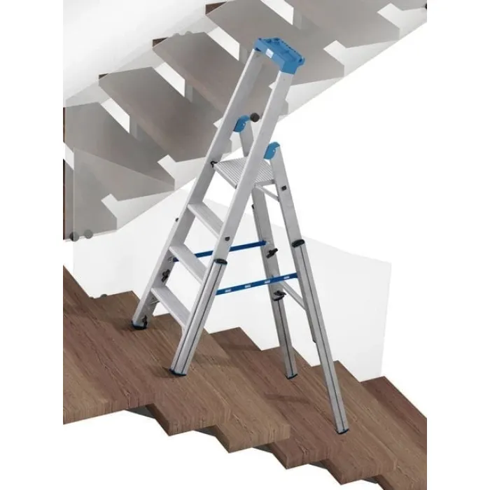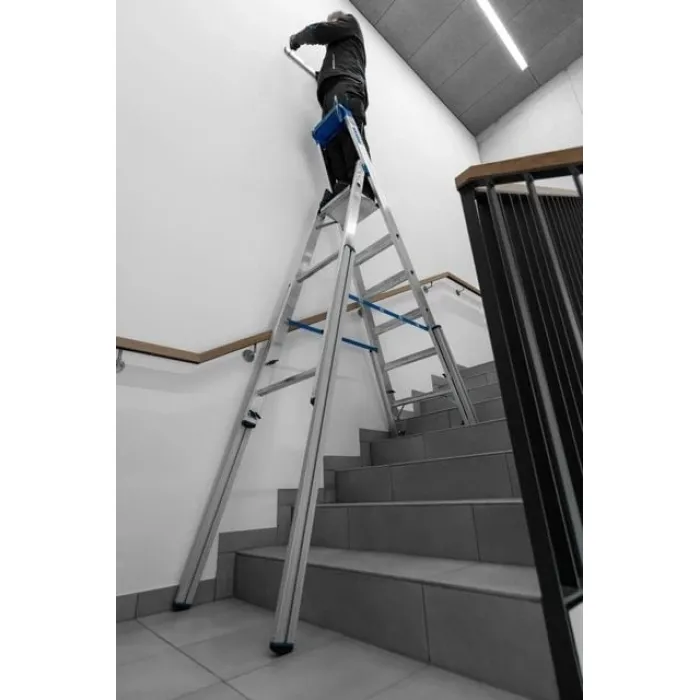 Четири безстепенно регулируеми релсови удължители със стабилен плъзгащ се водач позволяват използване на стълби и подобни разлики във височината. Анодизираните удължители на релсите осигуряват гладка работа. Външен плъзгащ механизъм с безкрайно променлив обхват на регулиране до 1150 мм на опорната секция позволява възможно най-голямата гъвкавост. Високобезопасна горна релса със завинтена поставка за инструменти за малки части и инструменти, вкл. интегрирана кука за кофа и държач за кабел. Здрава, едностранна алуминиева телескопична стълба с четири релсови удължители за професионална употреба по стълби, площадки, платформи и подобни разлики във височината.