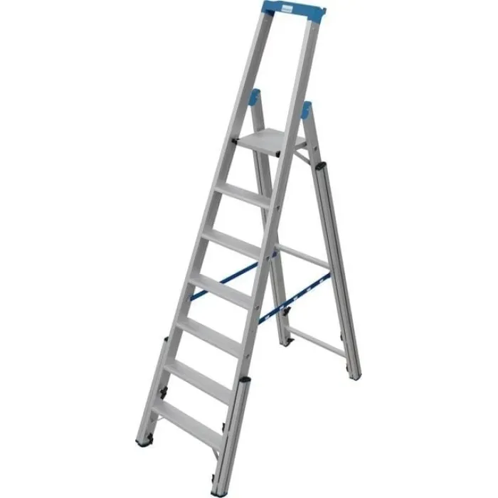 Четири безстепенно регулируеми релсови удължители със стабилен плъзгащ се водач позволяват използване на стълби и подобни разлики във височината. Анодизираните удължители на релсите осигуряват гладка работа. Външен плъзгащ механизъм с безкрайно променлив обхват на регулиране до 1150 мм на опорната секция позволява възможно най-голямата гъвкавост. Високобезопасна горна релса със завинтена поставка за инструменти за малки части и инструменти, вкл. интегрирана кука за кофа и държач за кабел.