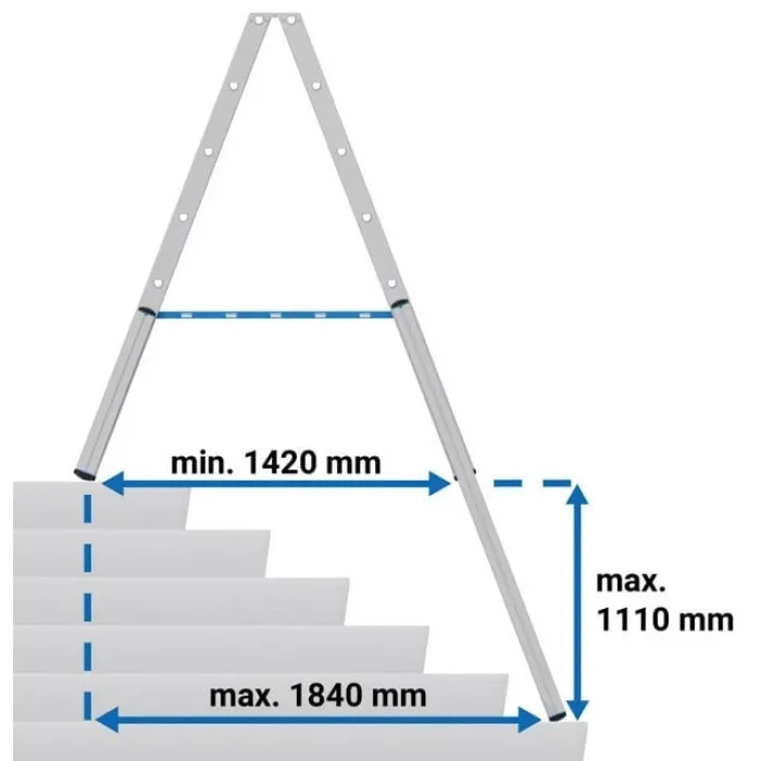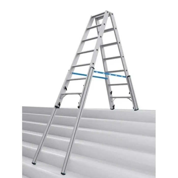 Четири безстепенно регулируеми релсови удължители със стабилен плъзгащ се водач позволяват използване на стълби и подобни разлики във височината. Анодизираните удължители на релсите осигуряват гладка работа. Външен плъзгащ механизъм с безкрайно променлив обхват на регулиране до 1150 мм на опорната секция позволява възможно най-голямата гъвкавост. Високобезопасна горна релса със завинтена поставка за инструменти за малки части и инструменти, вкл. интегрирана кука за кофа и държач за кабел. Здрава, едностранна алуминиева телескопична стълба с четири релсови удължители за професионална употреба по стълби, площадки, платформи и подобни разлики във височината.