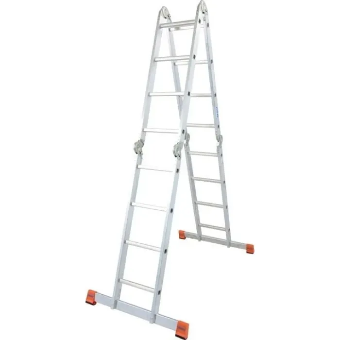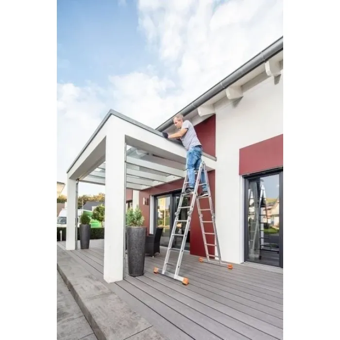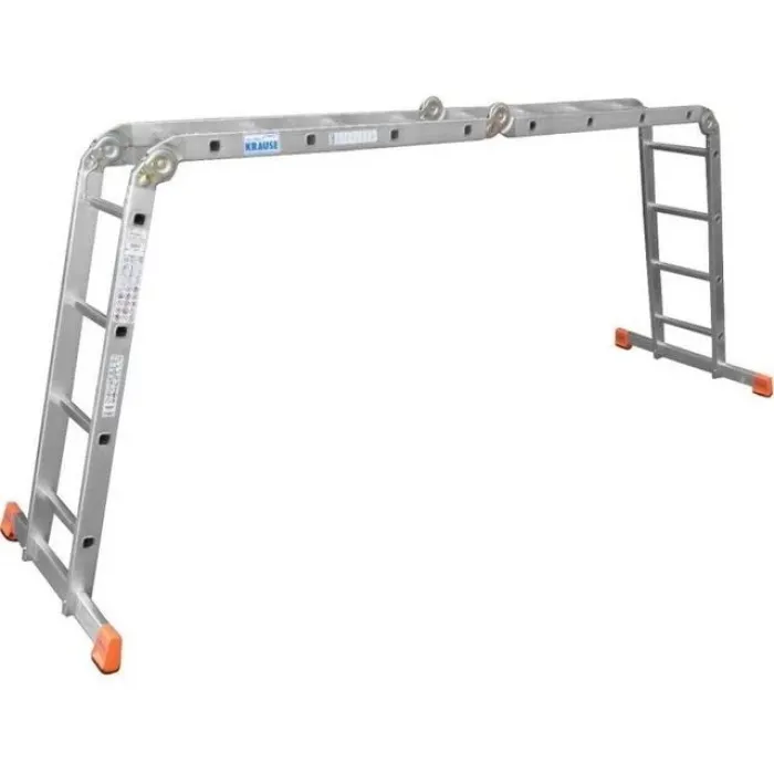 Многофункционална универсална стълба с панти, предназначена за използване като наклонена стълба, свободно стояща двустранна стълба и работна платформа (4 x 4 стъпала). Патентована заключваща панта с лостче за освобождаване с една ръка (SpeedMatic-System) за бързо и удобно боравене. Дълготрайни здрави връзки на стъпалата със страничните профили. Два изключително широки стабилизатора с противоплъзгащи капачки (SafetyCap). Сгъваема за съхранение на ограничено пространство.