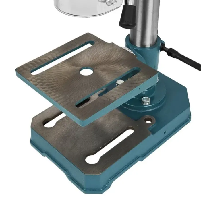 Устройството е задвижвано с клинов ремък с регулируема работна маса, регулиране на дълбочината на пробиване и регулиране на височината на масата. Освен това, бормашината е оборудвана с допълнителна защита срещу отваряне на капака по време на работа и допълнителна защита за очите. Настолната бормашина е мощна и ергономична бормашина за работа в дома, строителството и работилницата.