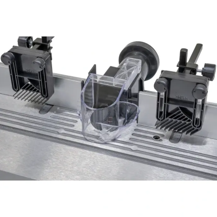 - Масивен фрезов ограничител с изход за прахоулавяне Ø100 mm, намаляващ замърсяването по време на работа.
