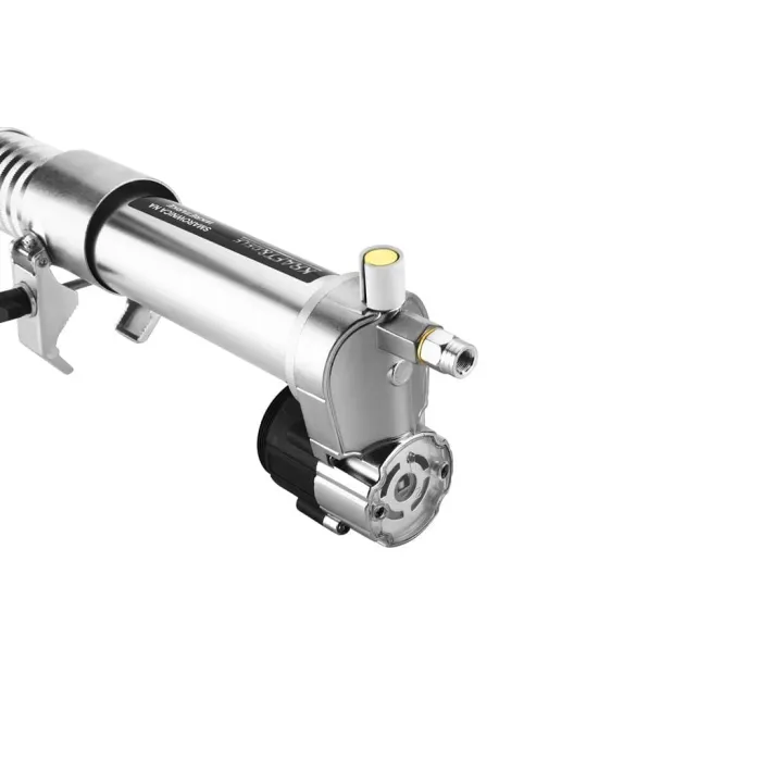 Гъвкавият маркуч, включен в комплекта, позволява прецизен достъп до труднодостъпни места, като лагери, панти, съединения и точки за смазване на селскостопанска или строителна техника. Здравата конструкция гарантира издръжливост и устойчивост на интензивна употреба, дори в тежки работилнически условия.