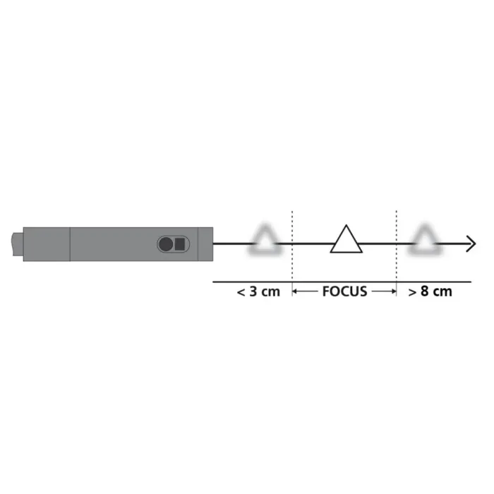 Дълбочина на фокуса (DOF) Отпред: 3 … 8 см / Отстрани: 2 … 5 см