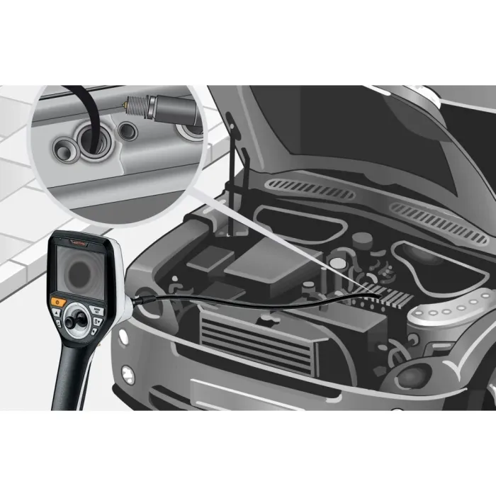 3D управлението позволява водонепроницаемата, подвижна глава на камерата да бъде оптимално настроена към местоположението. Осветлението на обекта с шест високопроизводителни керамични светодиода гарантира ясни изображения, дори и при най-тежки условия. Изображението може да се завърта на стъпки от 90° на висококонтрастния TFT дисплей. Функцията REC позволява запазване на снимки и видеоклипове за последващ анализ. Устройството има здрав механизъм за регулиране и издръжлив, гъвкав волфрамов кабел. Тази професионална система за видеоинспекция позволява идентифицирането на проблеми на труднодостъпни места. Камерата показва предмети, разположени зад или в стени, тръбопроводи или машини.