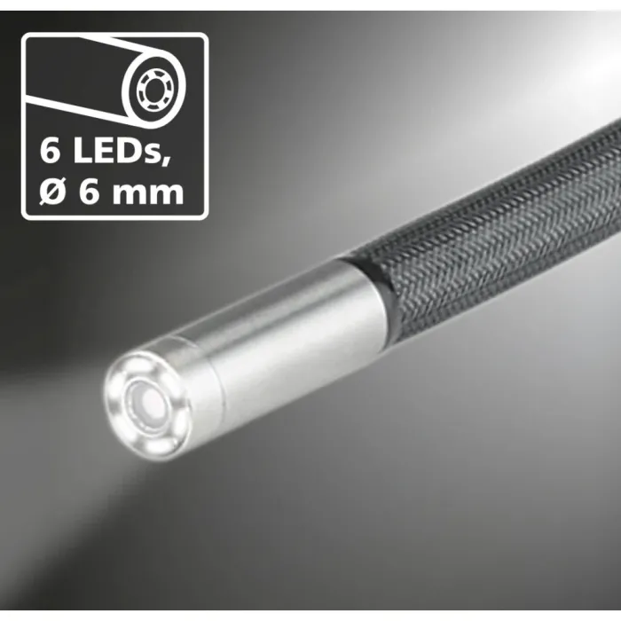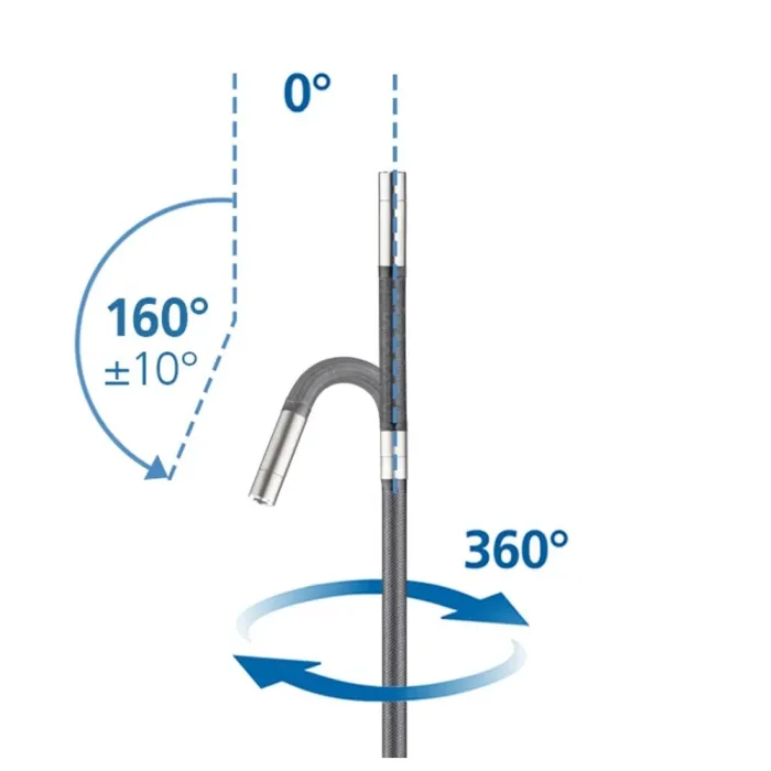 Водоустойчивата титаниева глава на камерата с максимална маневреност от 160° може бързо да се регулира до оптимална перспектива с помощта на 3D управление. Това прави възможно изследването на труднодостъпни зони, които не се виждат с фиксирани системи с камери. Благодарение на осветлението на обекта с шест високопроизводителни керамични светодиода, могат да се постигнат ясни изображения дори при най-лоши условия. Тази управляема камера за VideoInspector 3D с 1-метрова сонда предлага висока гъвкавост за сложна работа и е идеална за малки отвори.