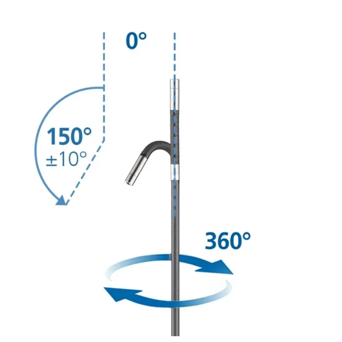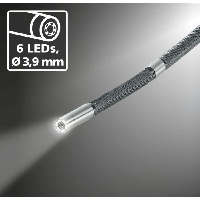 С помощта на 3D управление, водоустойчивата титаниева глава на камерата с максимална подвижност от 160° може бързо да се регулира до оптимална перспектива. Това позволява инспекция на труднодостъпни места, които са недостъпни с твърди системи от камери. Благодарение на осветяването на обекта с шест високопроизводителни керамични светодиода, могат да се заснемат ясни изображения дори при най-трудните условия. Тази управляема камера за VideoInspector 3D, оборудвана с 1-метрова сонда, предлага висока гъвкавост за сложни задачи и е идеална за особено малки отвори.