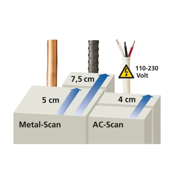 Целенасочено локализиране на метал: Ferro-Scan / Non-Ferro-Scan (METAL-SCAN): до 7,5 см / до 5 см дълбочина.