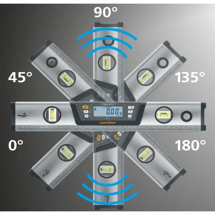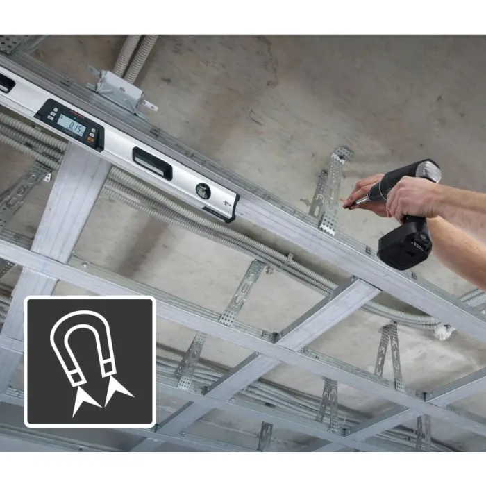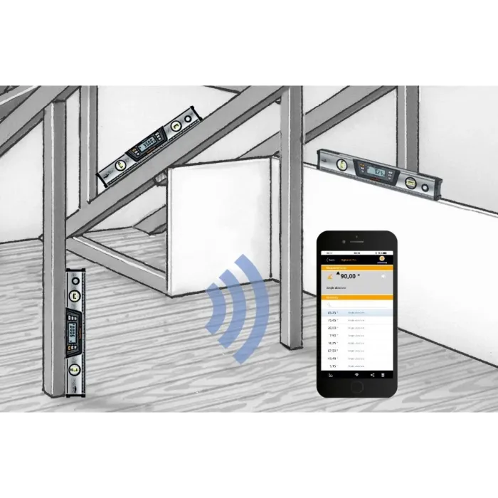 Устройството има изключително твърд алуминиев профил с фрезовани измервателни повърхности, устойчиво е на удари, прахо и водни пръски (IP 54). Предлагат се стандартни наклони за покриви, склонове и водосточни тръби. Измерените данни могат да се прехвърлят към мобилни устройства чрез цифровата връзка и да се документират изцяло с помощта на безплатното приложение MeasureNote. Този дигитален електронен нивелир осигурява прецизно хоризонтално и вертикално подравняване, както и прехвърляне на ъгли. Индикатори 90°/45°/0°, вграден точков лазер като оптично удължение и осветеният обръщаем дисплей за измервания над главата правят устройството лесно за употреба. Ръцете остават свободни при работа върху метални конструкции благодарение на магнитното задържане.
