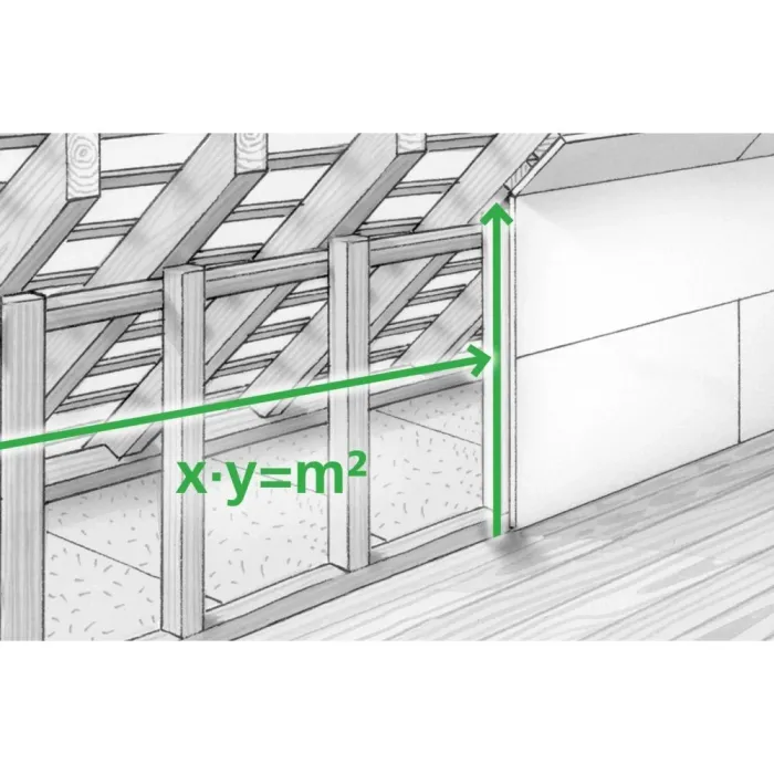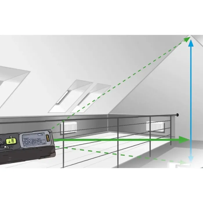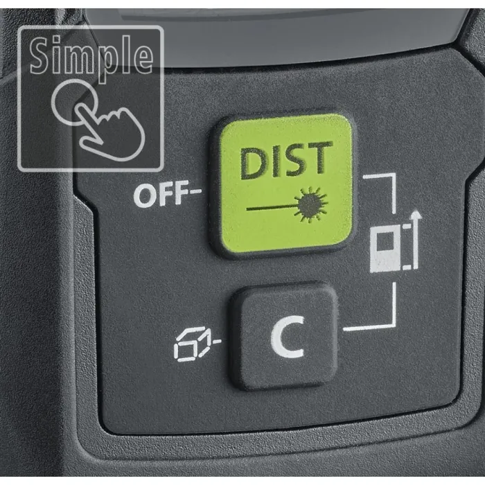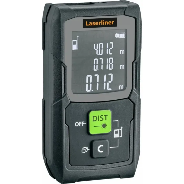 Височините и разстоянията могат да се определят индиректно, използвайки функцията за ъгъл на Питагор. Технологията със зелен лазер осигурява отлична видимост. Високочетлив дисплей с ясни бели фигури на черен фон, избираема референтна точка на корпуса и изключително компактният дизайн го правят много лесен за употреба. Мощната литиево-йонна батерия осигурява дълъг експлоатационен живот и след кратки фази на неактивност, първо лазерът, а след това и устройството, се изключват, за да пестят енергия. Този лазерен далекомер осигурява прецизно определяне на дължини, площи и обеми и е идеален за измерване на размери на помещения и изчисляване на количества материали.