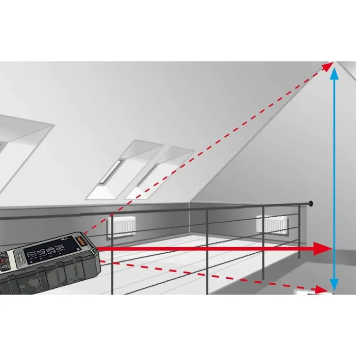 Функцията за непрекъснато измерване улеснява работата в ситуации, където са необходими непрекъснати измервания с разстояние, например когато целевият обект се движи по време на измерване. Референтната точка на корпуса може да се регулира, за да отговаря на конкретното приложение. Налични са 50 места в паметта за оптимално записване на резултатите от проекта. Енергоспестяваща функция за автоматично изключване, когато не се използва. Този универсален далекомер с обхват на измерване от 50 метра позволява точно измерване, събиране и изваждане на дължини, площи и обеми. Височините могат да се определят и индиректно, използвайки функцията за ъгъл на Питагор. Това означава, че може да се използва на труднодостъпни места.