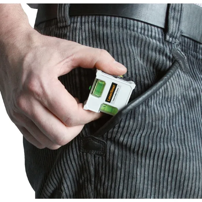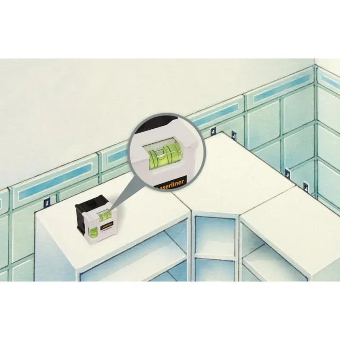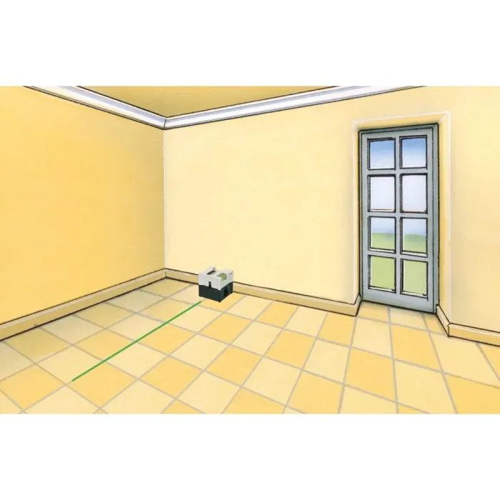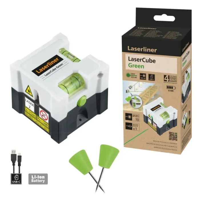 Специалните щифтове осигуряват сигурно и без повреди закрепване. Употребата е удобна благодарение на много яркия, зелен лазер и компактния корпус, който е изработен предимно от рециклирана пластмаса, допринасяйки значително за устойчивостта. Този практичен линеен лазер е идеален за бързо нивелиране на пода и стената. Устройството може лесно да се нивелира с помощта на вертикални и хоризонтални либели и може да се използва и като лазерен нивелир.