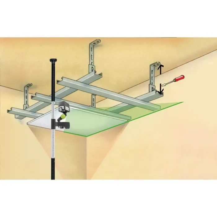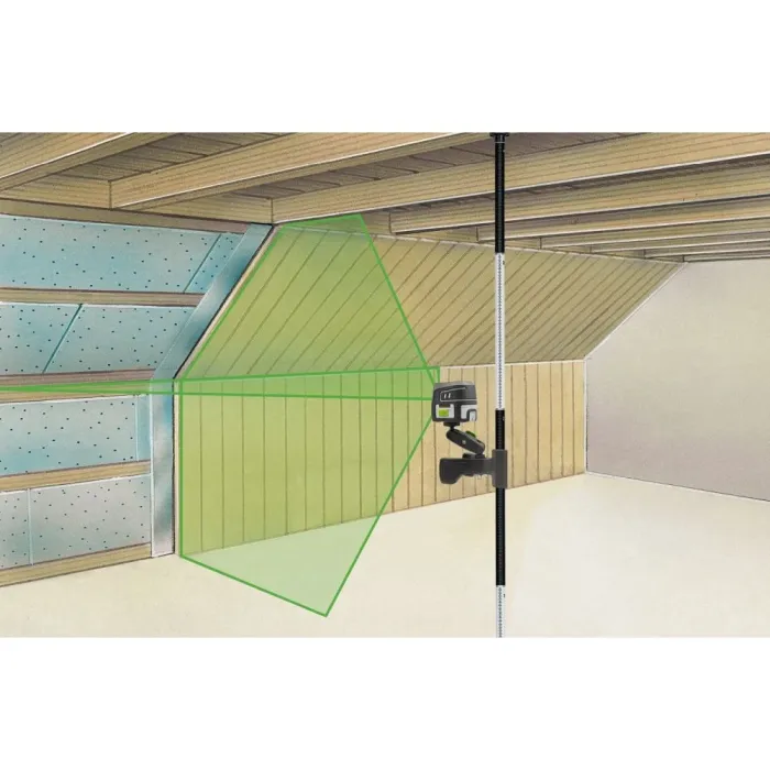 Той включва функция за ръчно наклоняване за лесно създаване на наклони и ¼” резба за монтаж върху универсалната скоба FlexClamp, която служи и като стабилна основа. С FlexClamp лазерът може бързо да се регулира по позиция и височина, след което да се закрепи към телескопичния прът TelePod, подходящ за помещения с височина до 3 метра. TelePod осигурява дълъг пружинен ход в основата на статива си и е изработен от лек, но издръжлив алуминий. Този лазер с кръстосани линии проектира силно видим зелен лазерен кръст, идеален за прецизно хоризонтално и вертикално подравняване на обекти. Корпусът на лазера е изработен от голяма част от рециклирана пластмаса и прави ценен принос за устойчивостта.