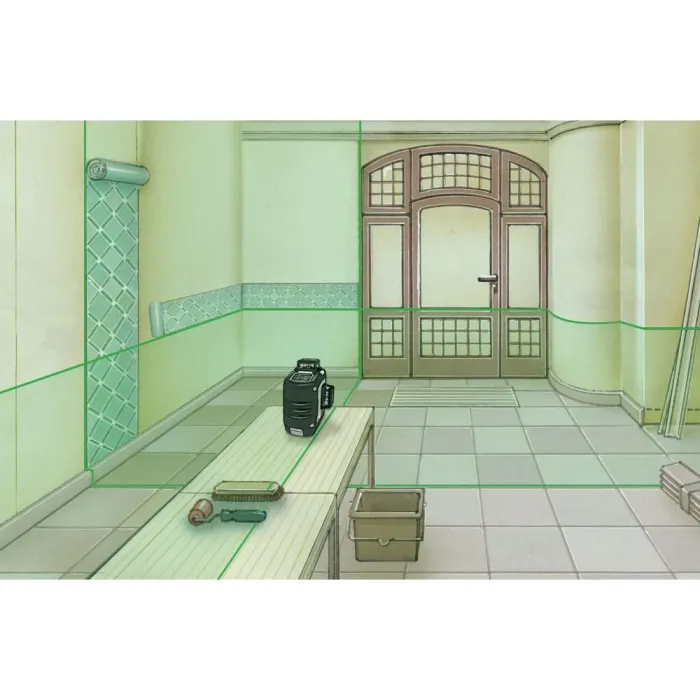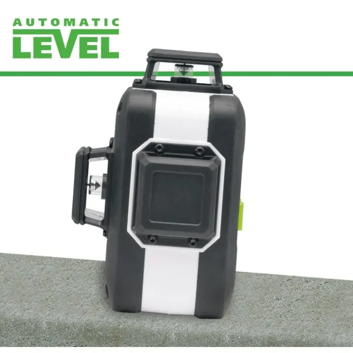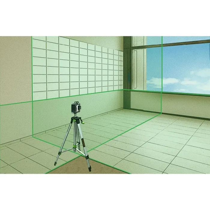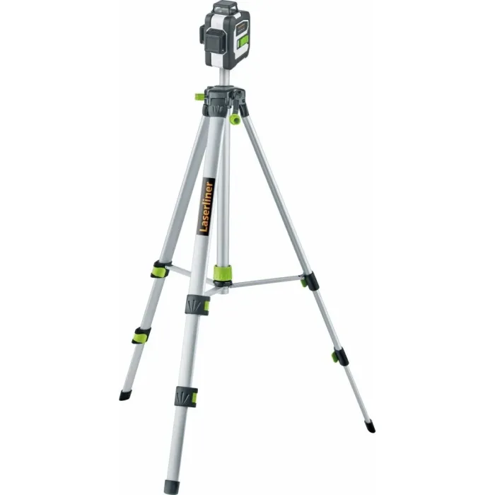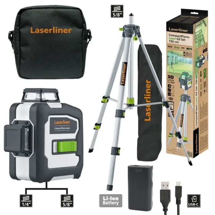 Градиентите могат лесно да се подравняват с помощта на функцията за ръчно наклоняване. Благодарение на ефективното предотвратяване на грешки при измерване с функцията за накланяне, устройството осигурява висока степен на надеждност на измерването. Този 3D лазер проектира един хоризонтален и два вертикални лазерни кръга, идеални за прецизно подравняване на обекти. Технологията със зелен лазер осигурява висока видимост, дори при най-неблагоприятно осветление. Цифровият интерфейс за връзка и безплатното приложение Commander осигуряват удобно дистанционно управление на лазера. Корпусът на лазера е изработен от голяма част от рециклирана пластмаса и прави ценен принос за устойчивостта. Лекият и здрав, компактен 150 см алуминиев статив има манивела и телескопични крака.